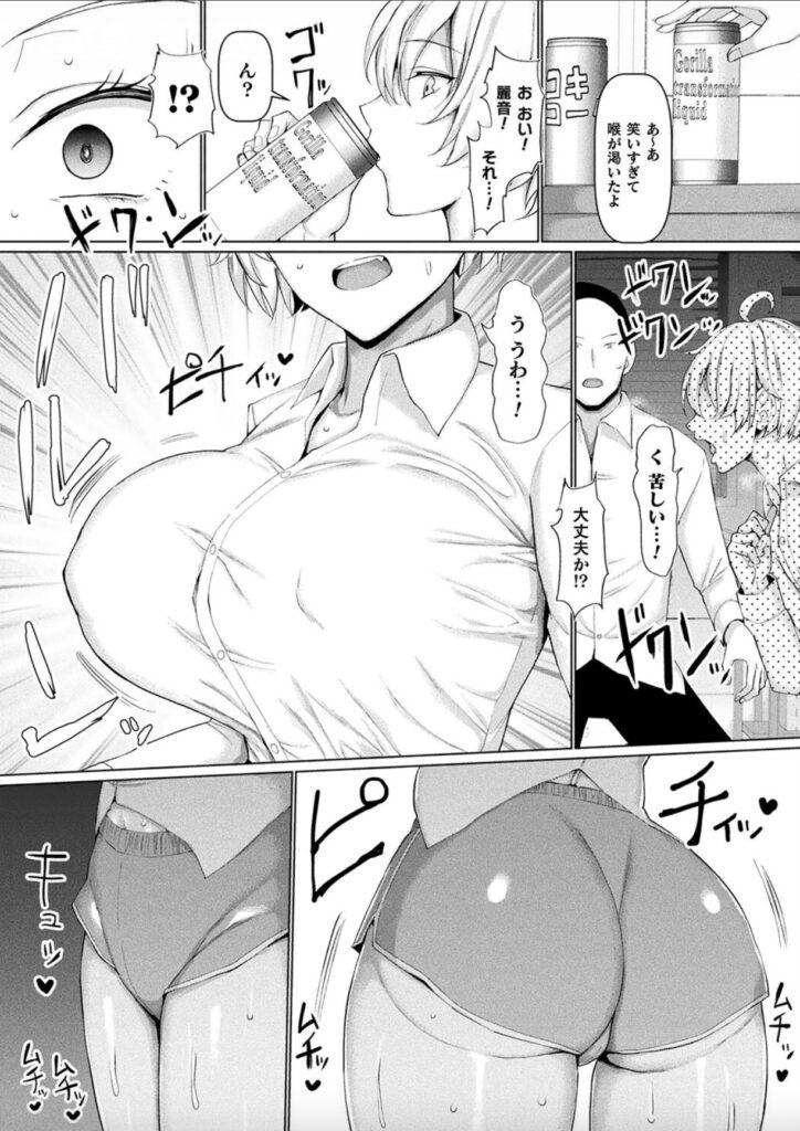 すると副作用により彼の身体は巨乳・巨尻化し、瞬く間に豊満な女性のものへと変貌。自身の身体の変化にとまどいながら無防備に爆乳を震わせ助けを求める麗音だったが、その姿に興味と性欲が抑えられない武雄の頼みを聞き、張り詰めたシャツのボタンを開放すると要求はさらにエスカレート。