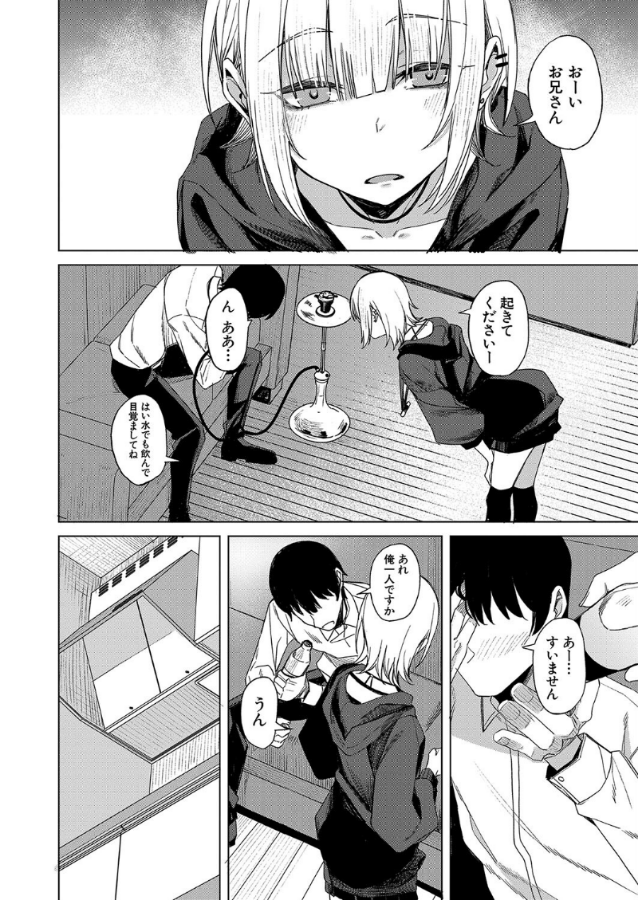 閉店後のシーシャ屋に残された青年と、その店のバイトの女子店員。介抱してくれた店員に憧れの先輩の話で盛り上がっていたことを話す青年だったが、彼女の胸を見ていたことをきっかけに、誰もいない店の中で次第にエロい雰囲気になっていく。実は童貞だった青年は、彼女に気取られないようにするが、淫靡な彼女には抗いきれず……!