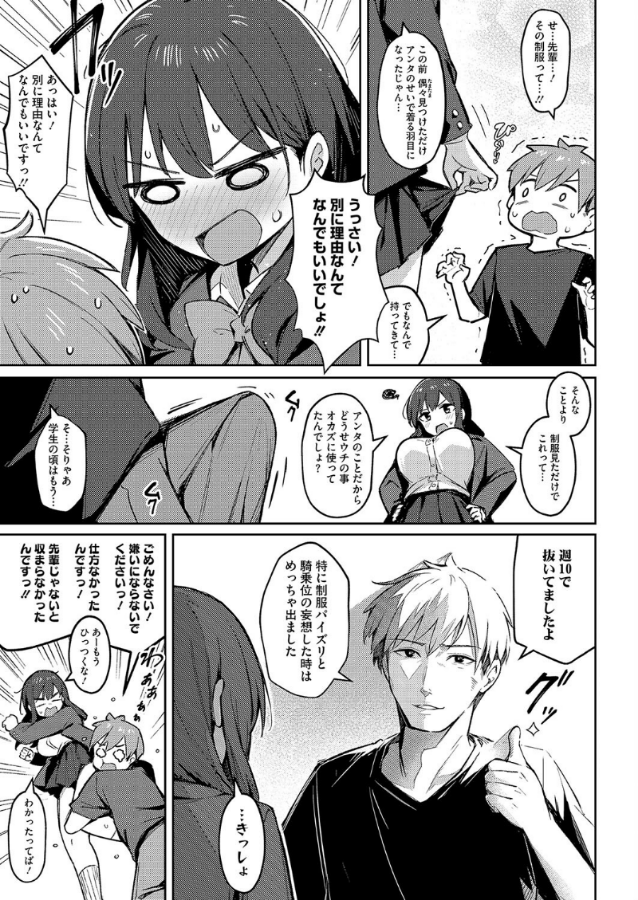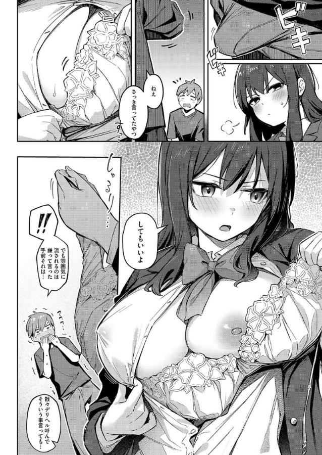 大学生・武内が●校の時に憧れていた智咲先輩への想いを断ち切るために呼んだデリヘル嬢・チヒロさん。先輩に瓜二つのチヒロさんにハマる武内。ある日のプレイでチヒロさんは出勤最後の日だからと、本番してもいいよと誘うが、チヒロさんに先輩の面影を重ねていたので悪いと断った。そんな武内にチヒロさんは挿入さながらの素股で射精させた際、自分が智咲本人だとバラしたが武内は気を失ってしまう。数週間後、智咲先輩が武内の部屋を訪れて……。