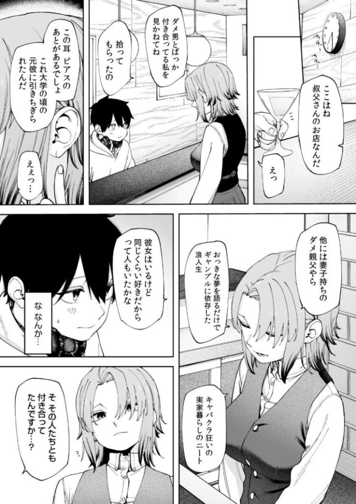 オフ会の数日後。リオとぎこちない関係になってしまったリツキは、パーティのメンバーの一人・ライラさんが働くバーを訪れていた。バーと同じく落ち着いた雰囲気をまとうライラさんには、なにやらいろいろなことが見透かされているようで……。「リツキくんのこと……楽にしてあげる」頭の中にうずまく悩みを話したリツキへの、ライラさんの答えとは……。