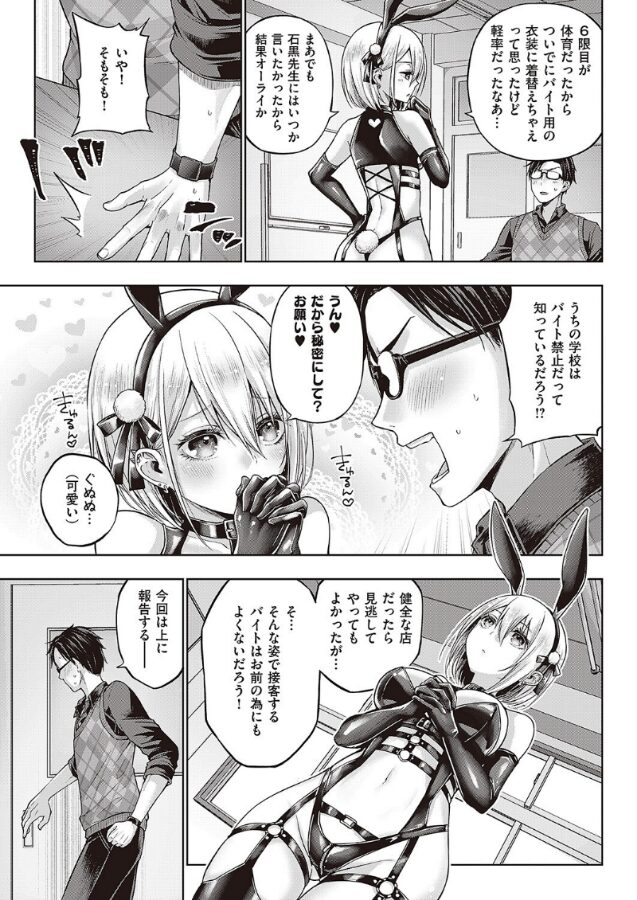 金髪問題児・卯月が過激なボンテージバニー衣装でアルバイトをしていると知った担任・石黒。内緒にしてほしいと懇願する卯月は「今からする先生とのセックスを秘密にしてあげる」と身体を差し出してきて…!?69で「イッたら負けゲーム」を始める小悪魔な卯月にはお仕置きスパンキングで愛のムチ●コを喰わせてやる!ラブもエロも大満足の超新星・メツブシ先生の描く、刺激的すぎる生意気JKを分からセックス♪