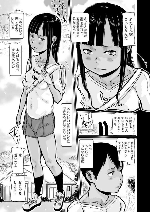 唐突にクラスで班分けが行われ、もともと孤立する事が多かったので同じように最後に残ったオトナしめの男子とペアにさせられた。放課後ふたりで勉強するコトになり家に向かう。ギリギリの部屋着でエッチなポーズして挑発してみると男子の顔が赤らめてゆくのが可愛く思えてきた。2人ともエスカレートしてセックスに発展しお互い初めてなコトだらけなのにしっかり膣奥に射精してしまう…